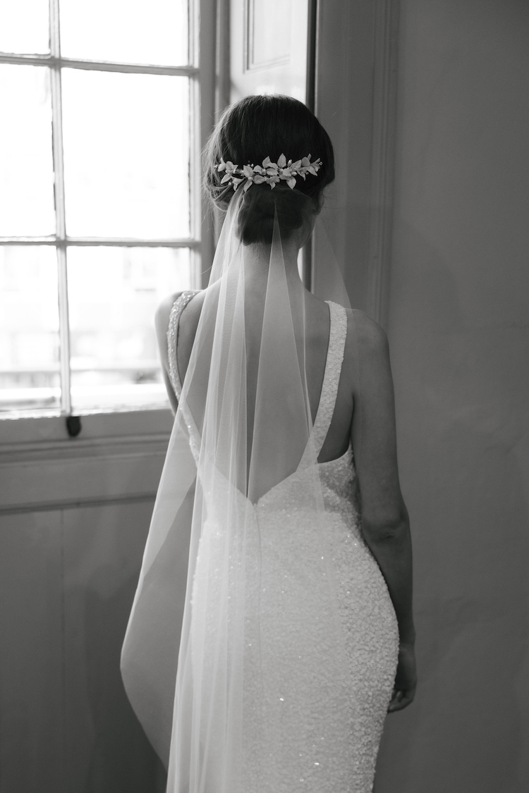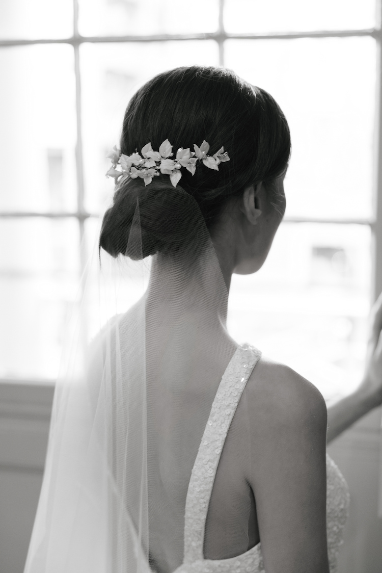 Our love for the botanicals has a strong presence in the Elana floral bridal headpiece, by beautifully balancing the simplicity of foliage and leaves in a delicate vine-like silhouette. We love to pair this headpiece with a sheer wedding veil allowing you to create two looks in one by simply removing the wedding veil after the ceremony for your reception. DANCER veil sold separately