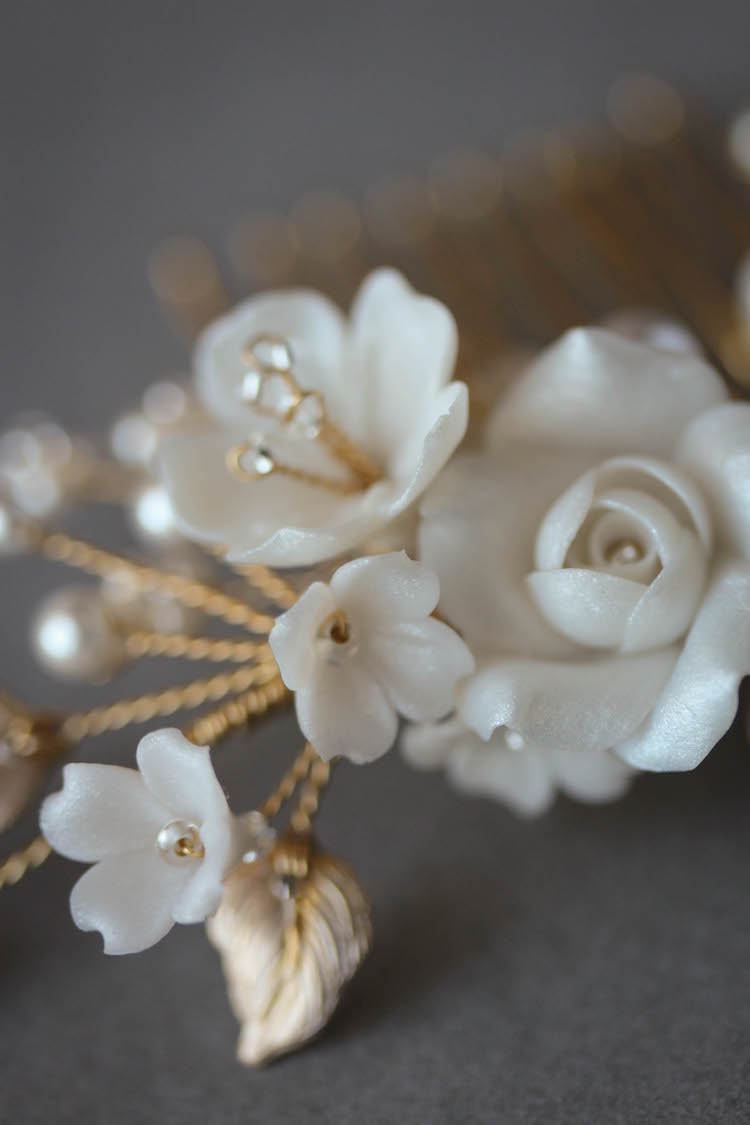 Inspired by springtime—the season of new beginnings—the Primrose bridal hair comb is a fresh take on a traditional style. This compact comb features a floral display of dogwood flowers and a rose in full bloom. The classic colour palette of soft ivory and silver or pale gold suits a range of bridal looks.